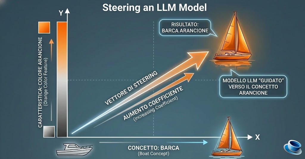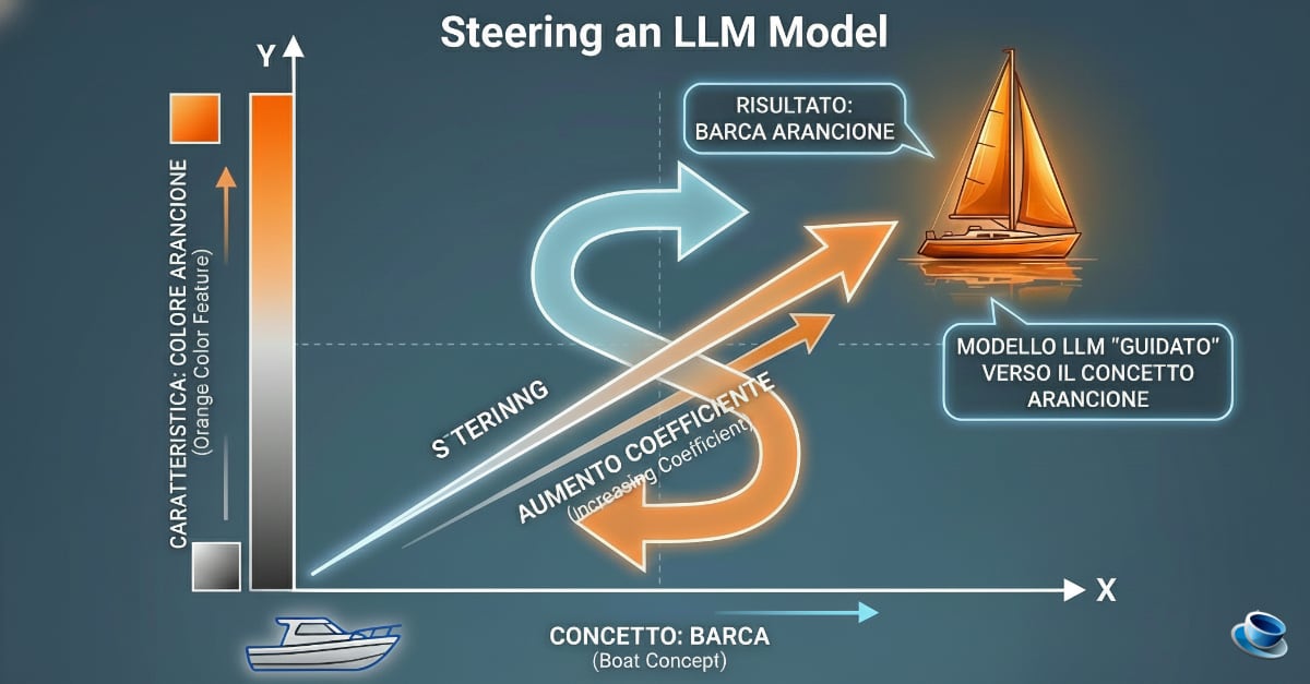 Attraverso tecniche di interpretabilità (come quelle studiate da Anthropic con i “Golden Gate Claude”), i ricercatori possono identificare esattamente quale direzione nel “cervello” del modello corrisponde al concetto di arancione. Questo è il nostro Vettore di Steering. È come una bussola che dice al modello: “Qualunque cosa tu stia pensando, spostati un po’ più verso questa direzione”.